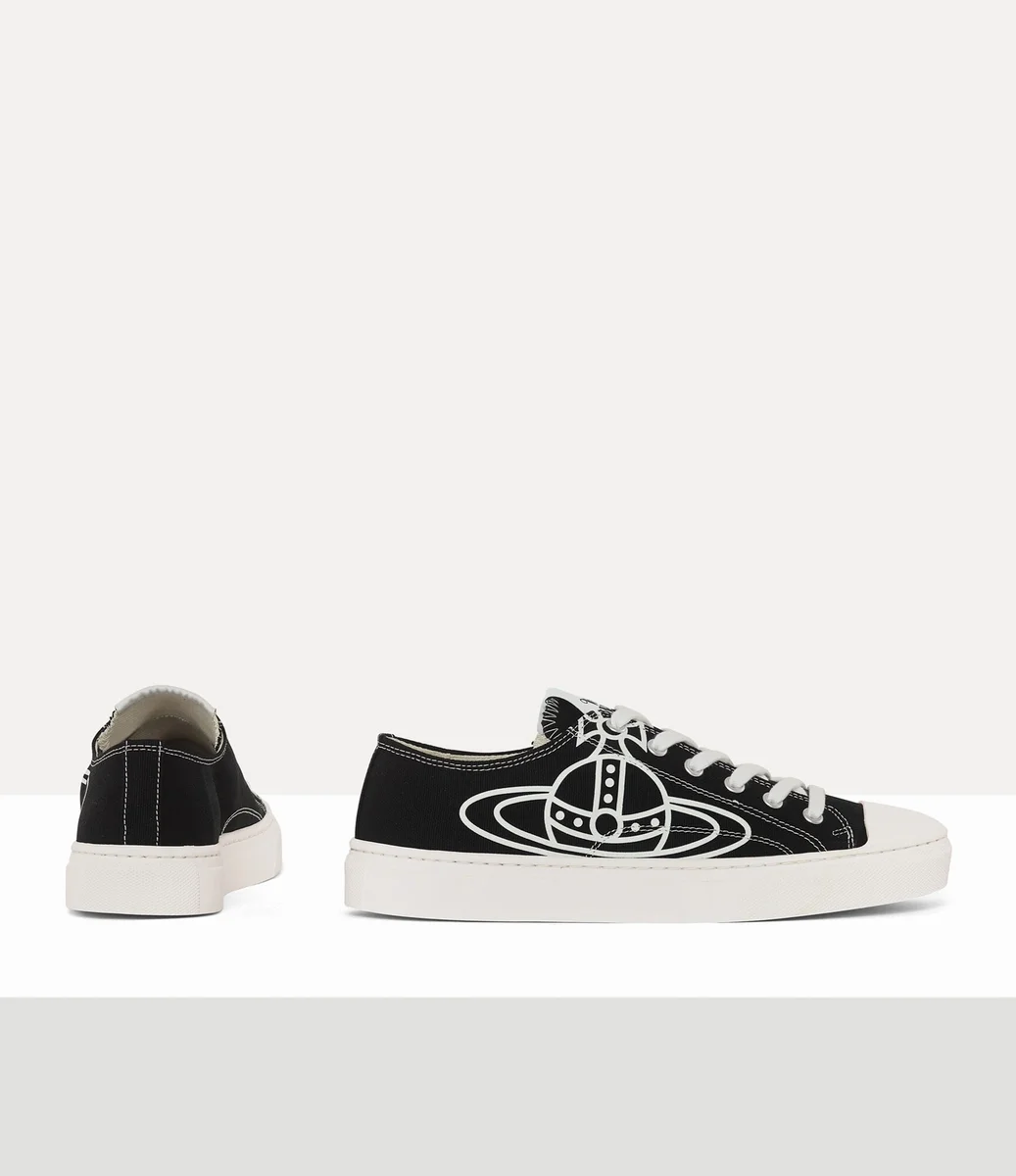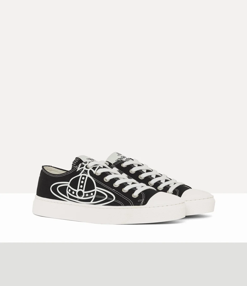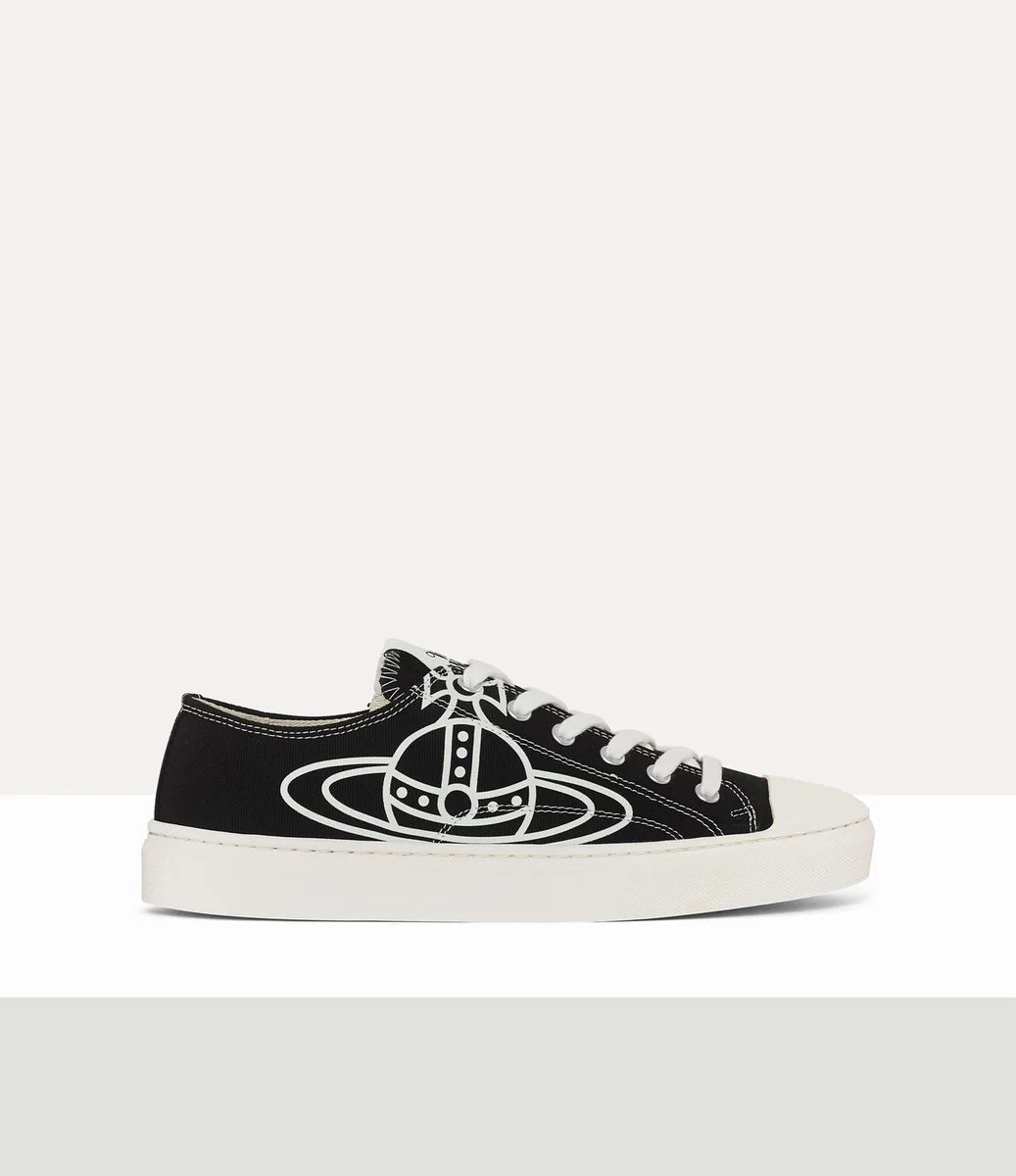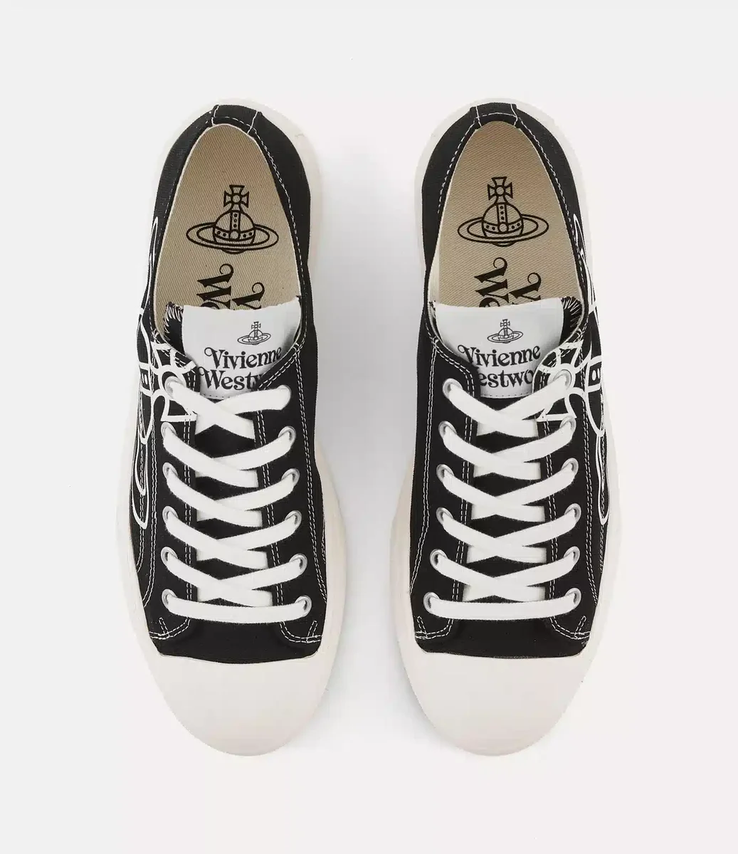 Our Low-top Canvas plimsolls features the house’s archival ‘Line Orb’ motif across the design – synonymous with Vivienne’s vision of launching tradition into the future. The piece offers a cotton canvas finish, adorned with a woven label on the tongue.